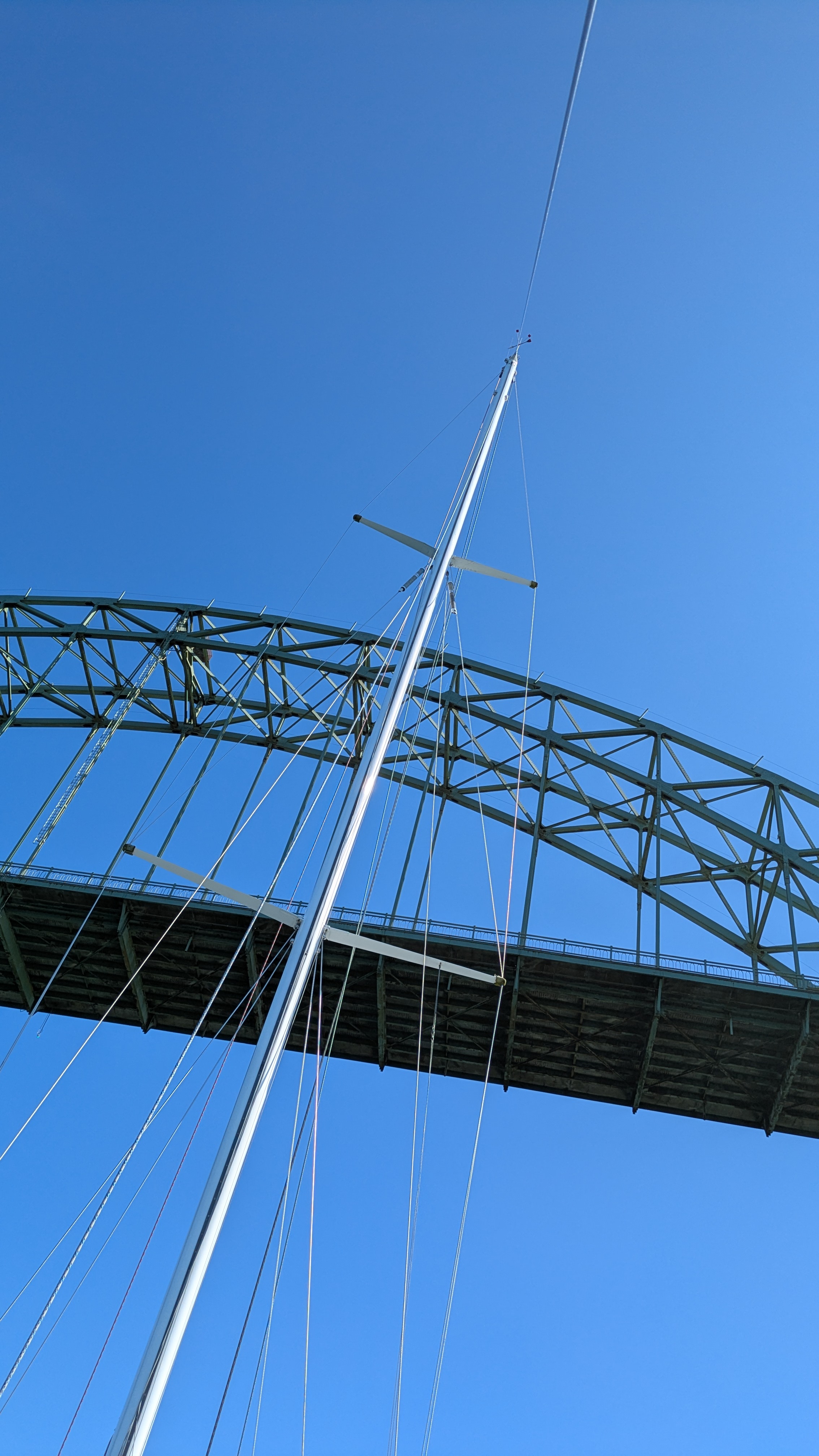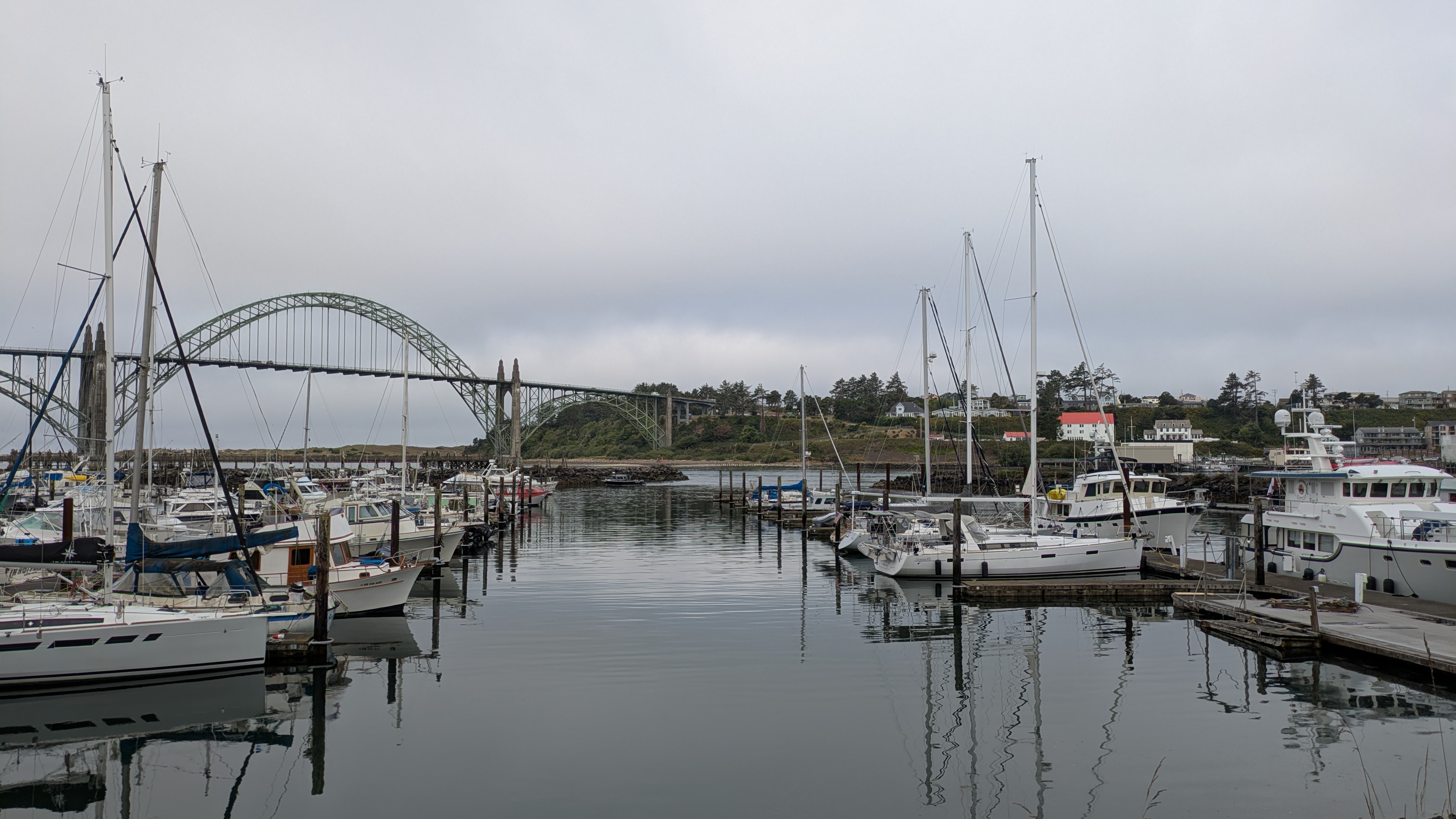 I decided my best option was to make a 24 hour run to Newport, Oregon. I headed out of Brookings in the morning fog for the long motor north. With a bad back and light winds from the north sailing was not an option. I spent a lot of time lying down with the iPad mirroring the chart plotter. The good thing about nighttime travel is there is a lot less traffic. Most of the night it was so foggy there was no chance of seeing anything anyway. A few fishing boats on AIS were the only traffic and they were never a real concern. I arrived to a sunny Newport Harbor on schedule and passed under the bridge that spans the entrance.