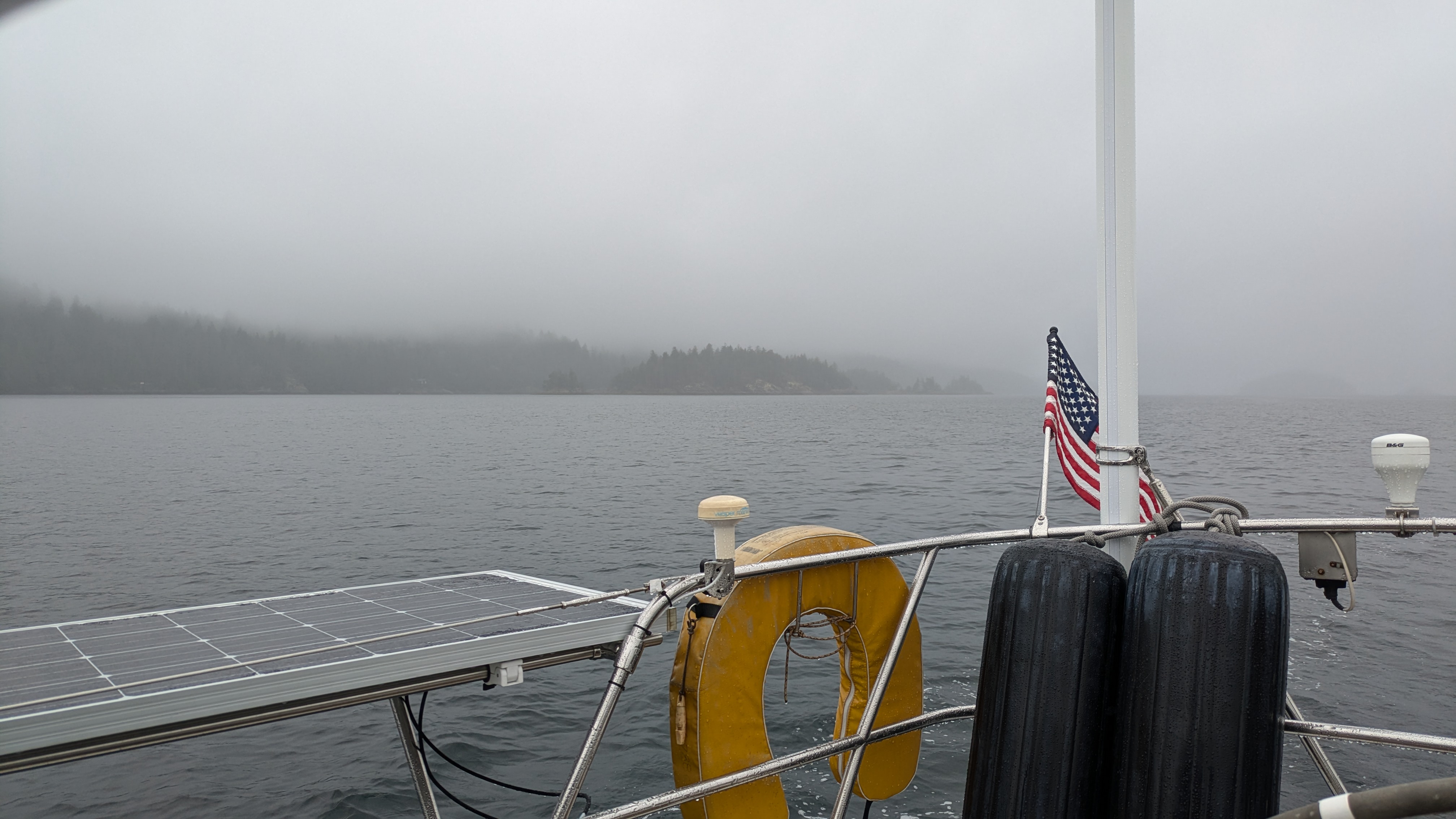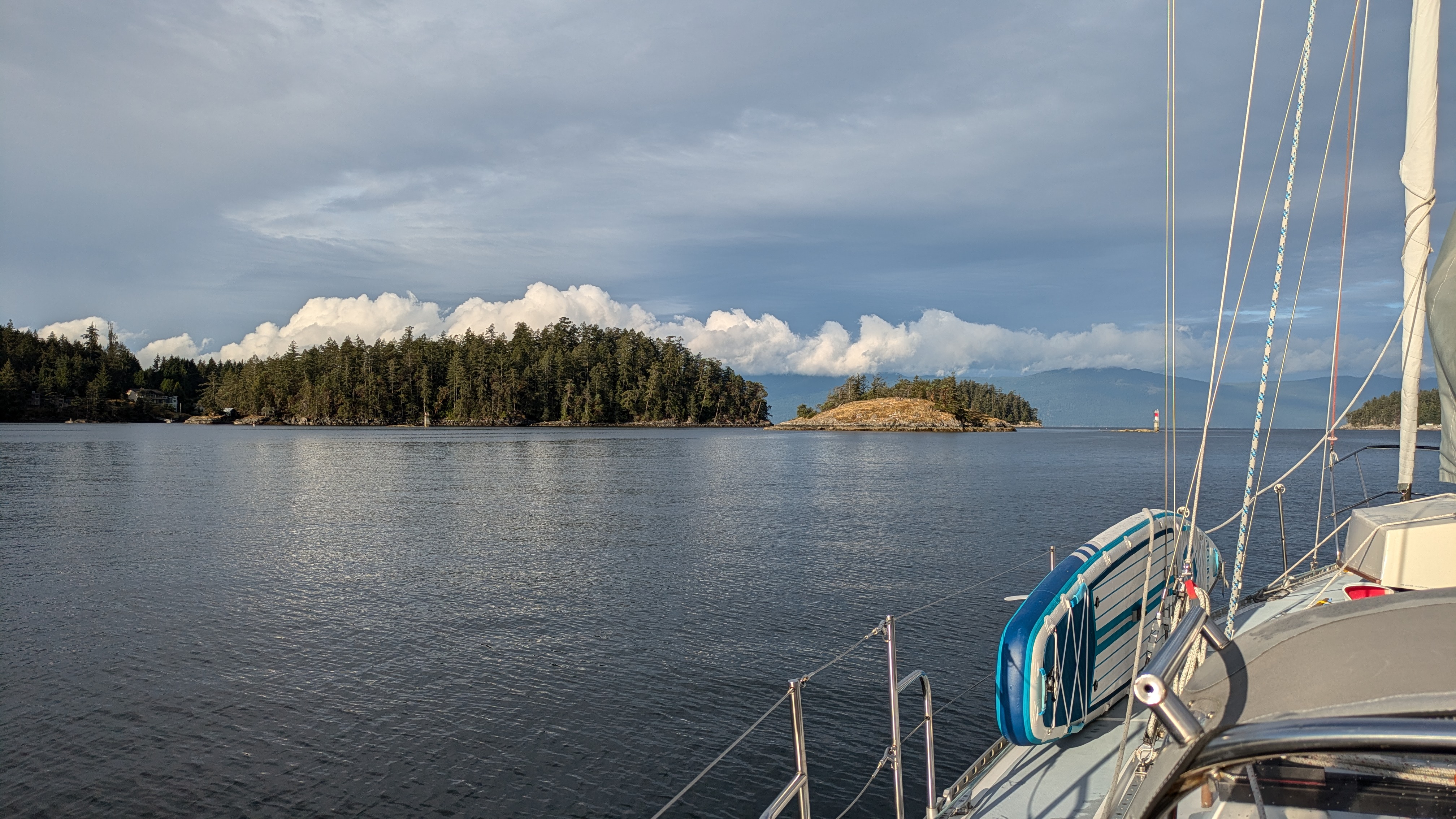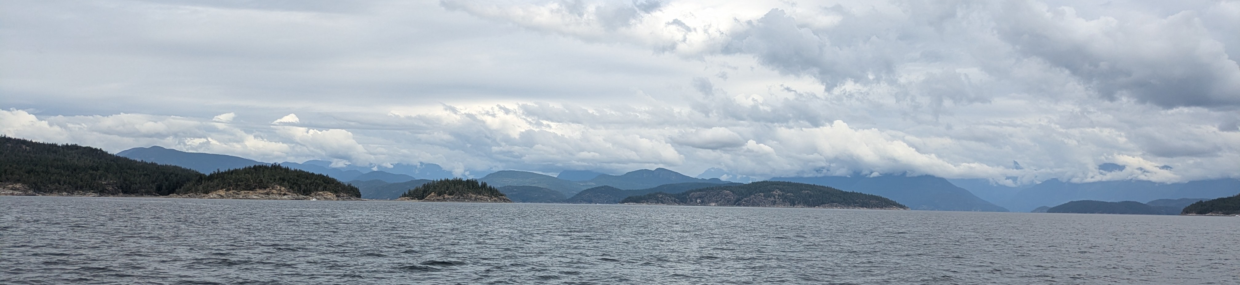 After waiting out the front that rolled through BC on Sunday I departed Pender Harbor early Monday morning for the long run up the rest of the Georgia Strait to overnight in Cortes Bay on Cortes Island. The day started out sunny and nice leaving Pender Harbor.