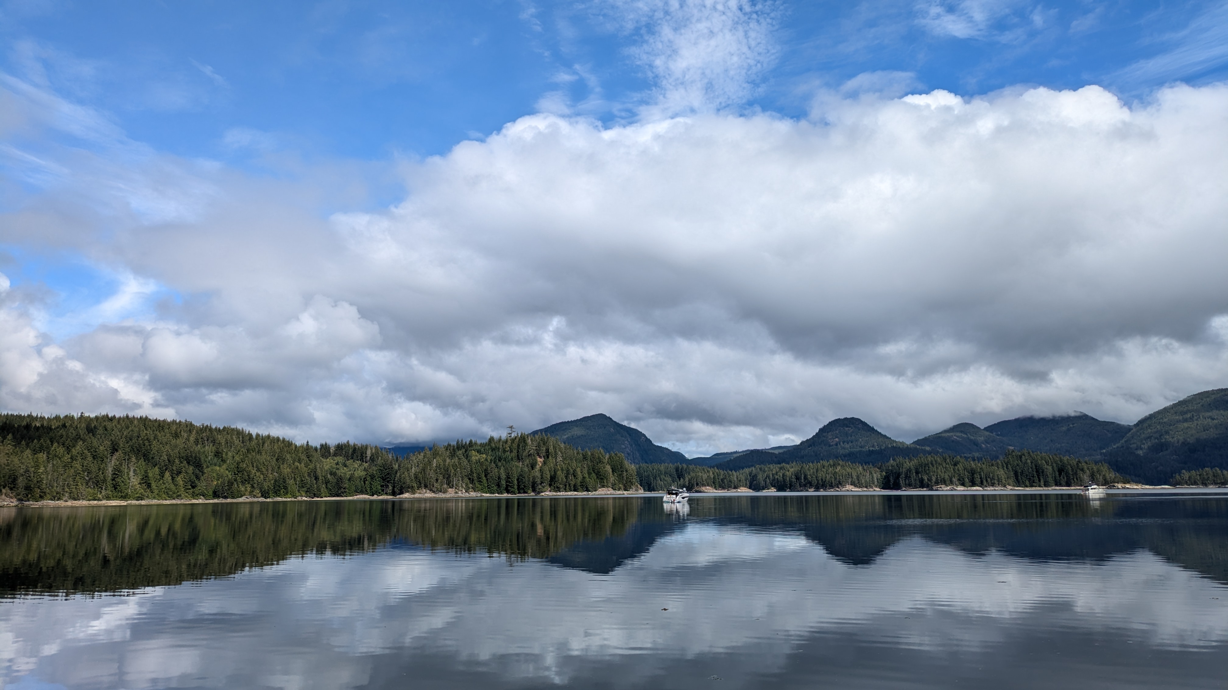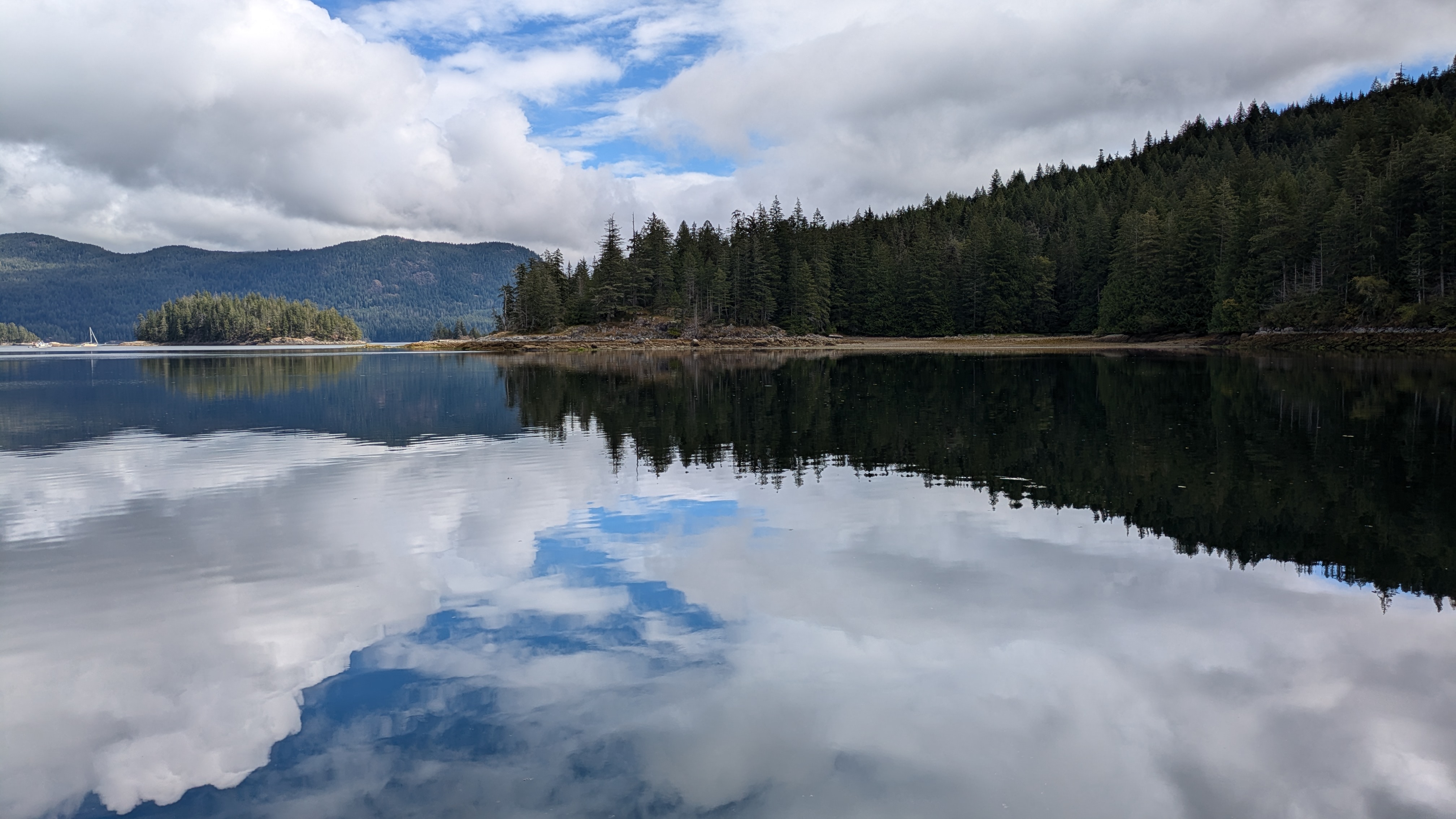 I had to slow way down as I approached Beasley Passage. The ebb tidal flow was pushing me most of the way there. Better early to these things than late. I was the only boat going north. I met a handful of boats going south, one of which I shared the pass with. Both the pass and the Narrows were smooth and presented no problems. Having the ebb tide with me I made quick time up the entrance to the Octopus Islands Marine Park where I expect to stay for several days. It's very nice here and not crowded so far. I'll wait for my chance to head north up Johnstone Strait in calm weather. For now, more rain then some sunny days with views like these.