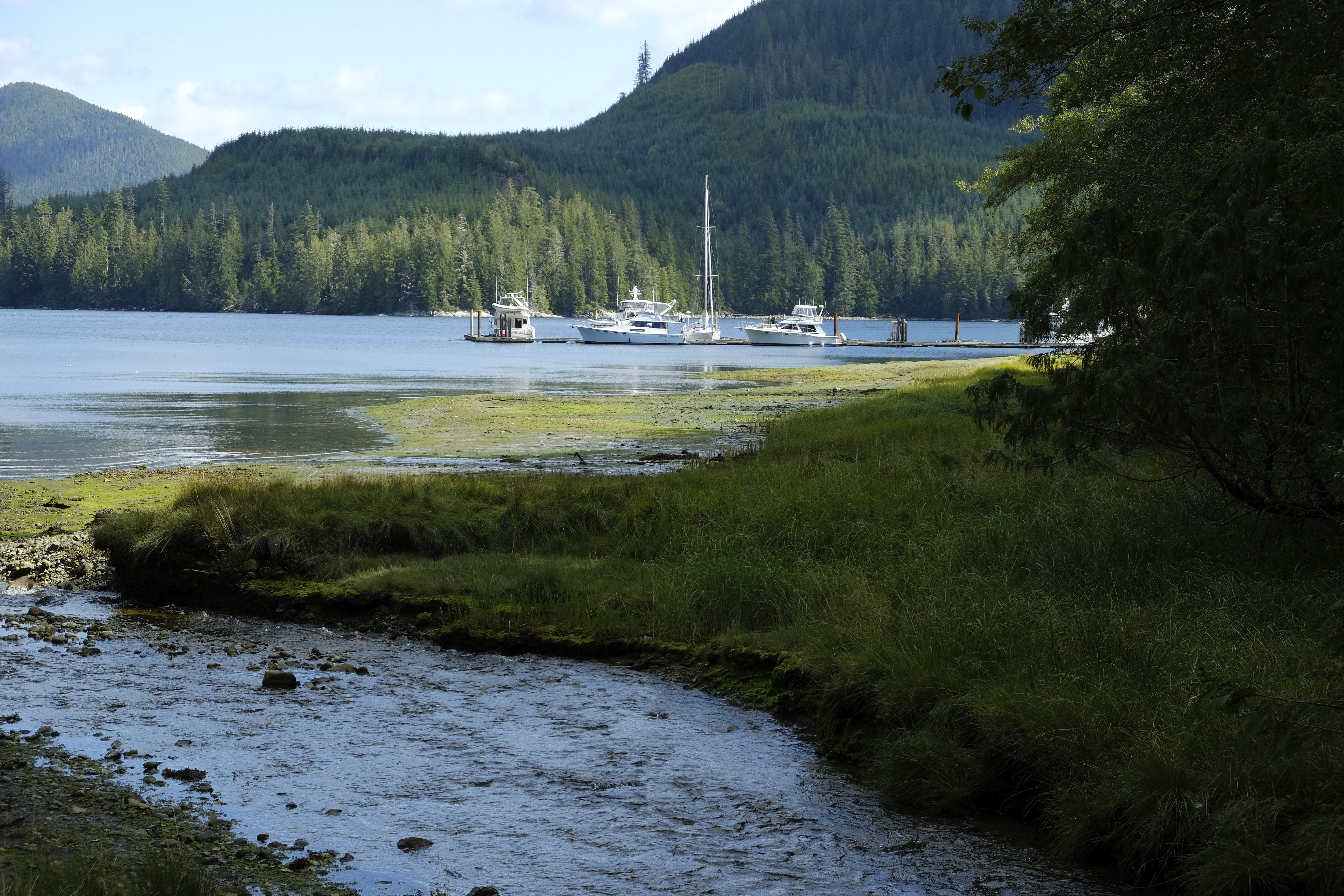 Fresh water stream flows down into Mayne channel with the marina in the background