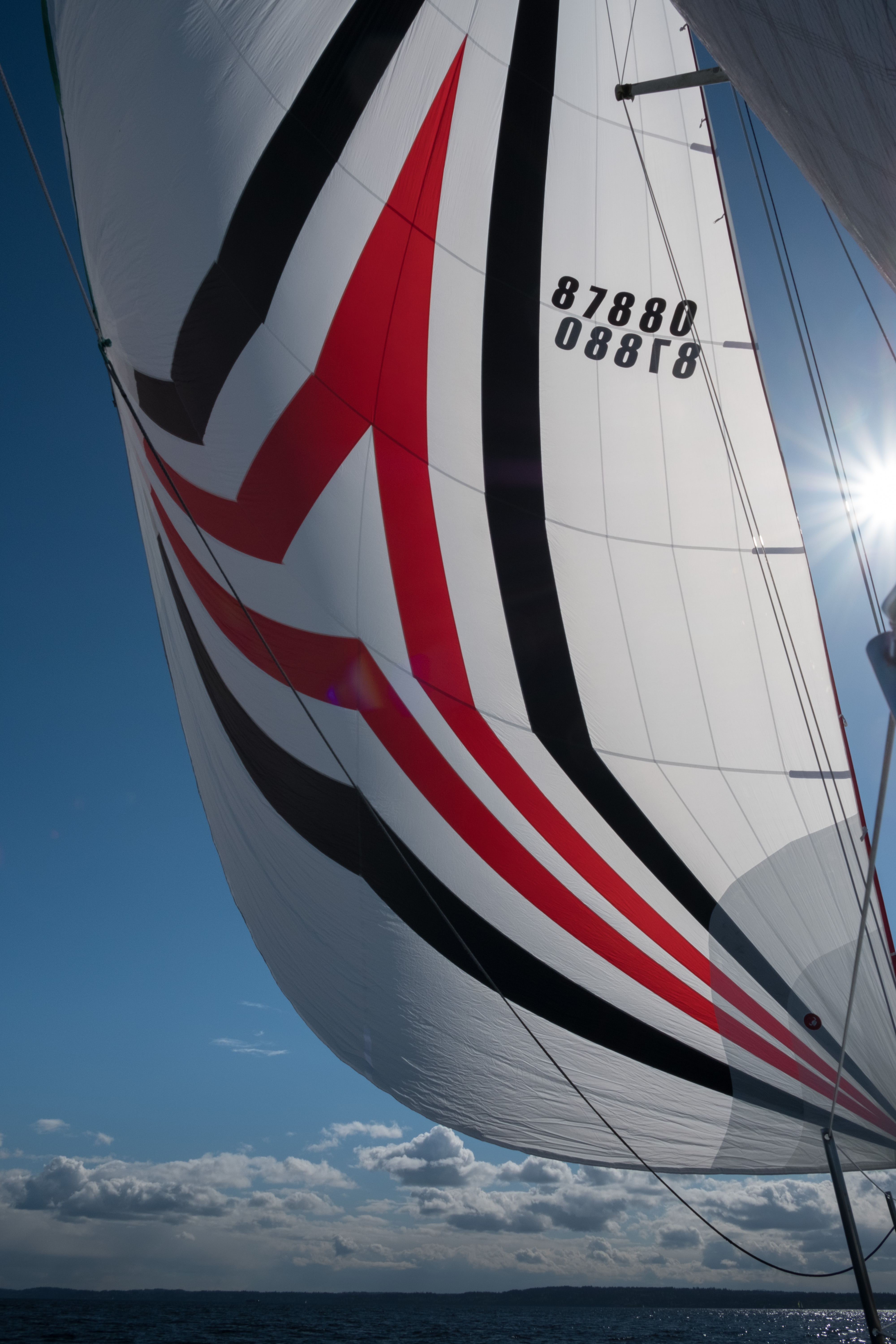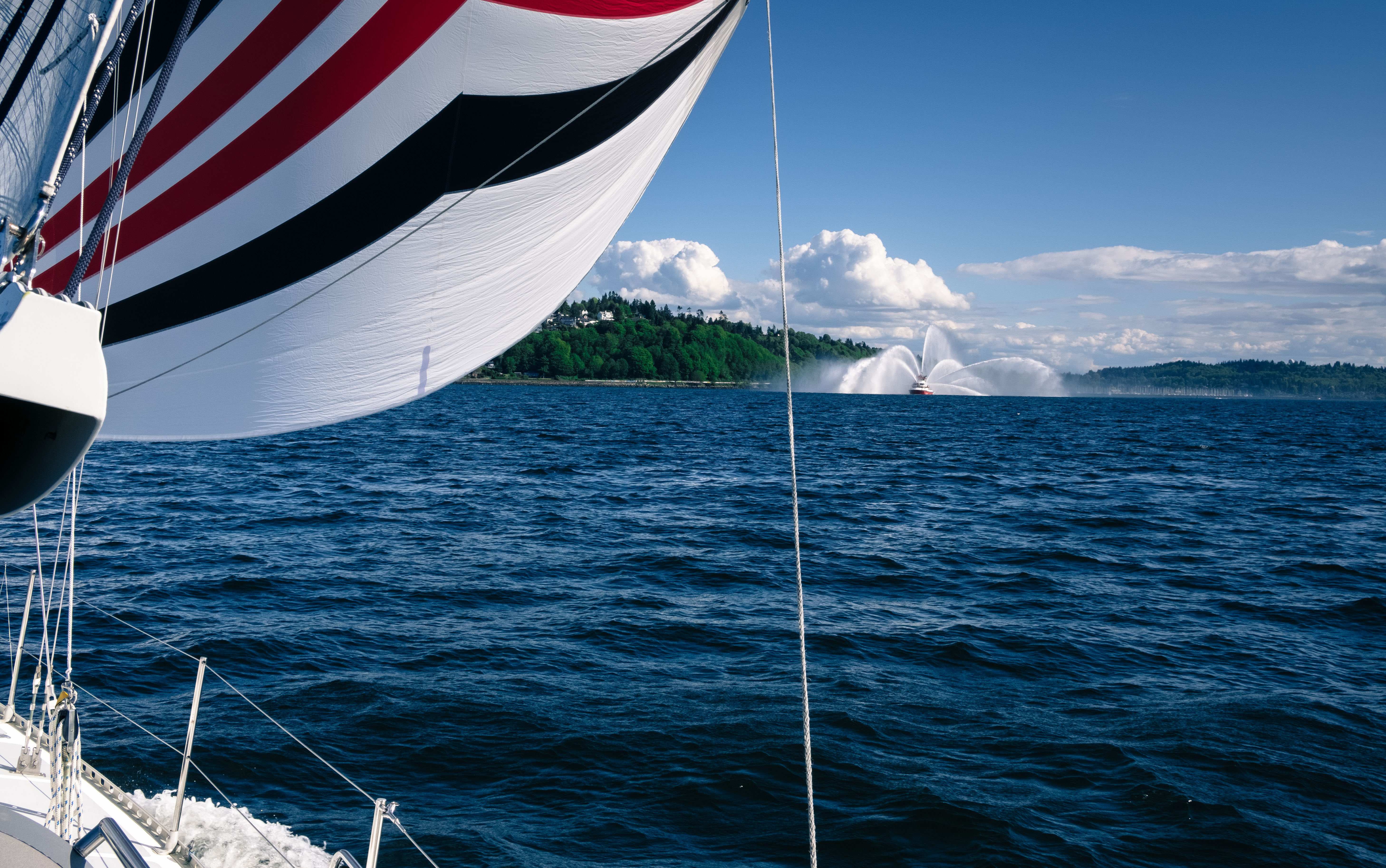 Practice session between races landed on opening day here in Seattle. Surprisingly few boats out on a really nice day. The Seattle fire boat was putting on a show at the Meadow Point buoy where we wanted to do some practice starts so we sailed up to Richmond Beach. The whole crew took turns at the helm learning what it is like to time a start line. We also spent time getting everyone more familiar with the chart plotter so we all know where we are and where we're going. The run back home was a good chance to get the A3 out of the bag. Only took a few gybes and we were done. Nice to see the sun again.