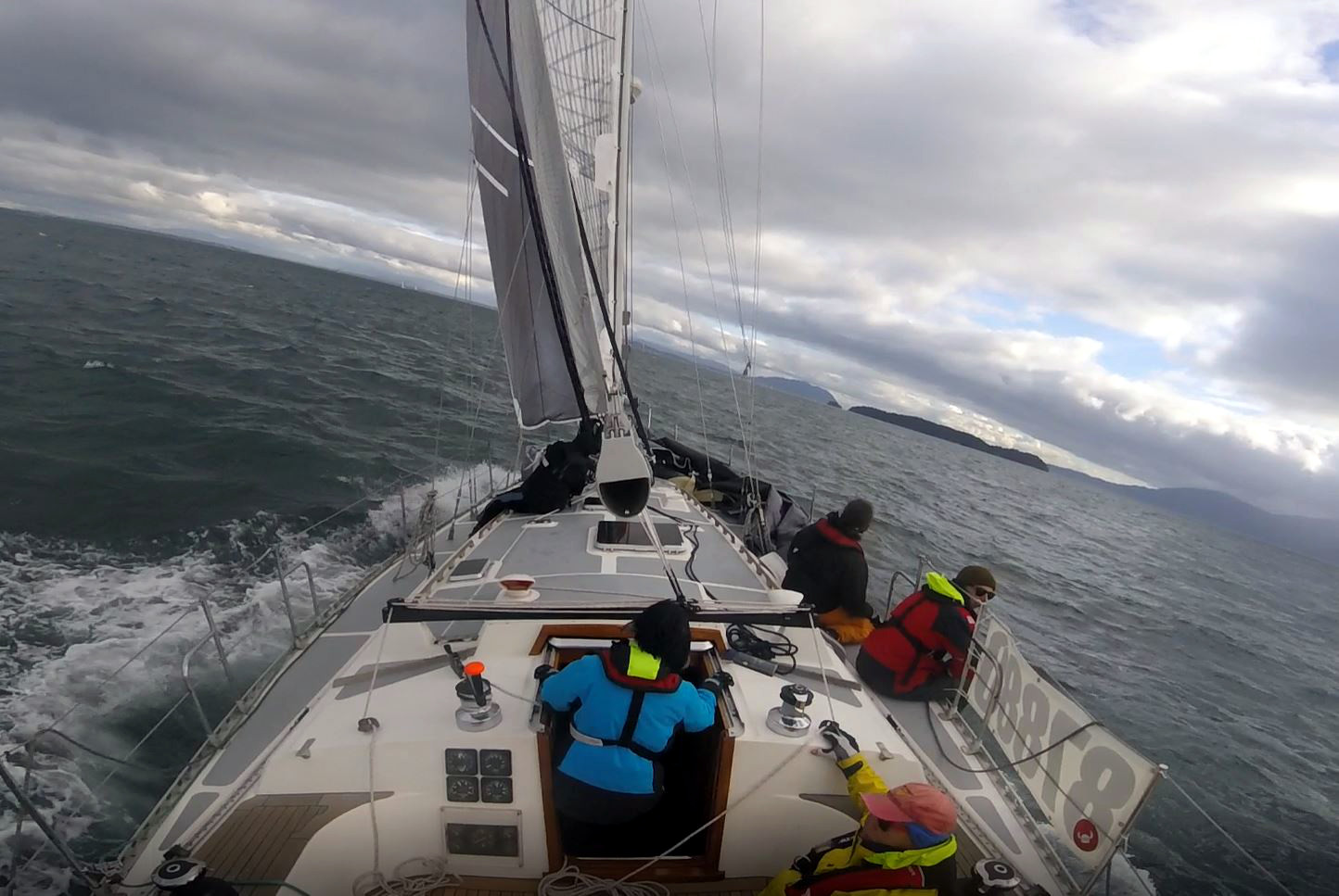 After Turn Point the wind slowly began to build in phases. We eventually changed out the #1 for the #3 as it built to 22-25K apparent. For a while we were close reaching under the #1 like a freight train, staying in a band of wind watching boats north and south drop behind. We were gaining back some time quickly with boat speeds in 8-10K range.