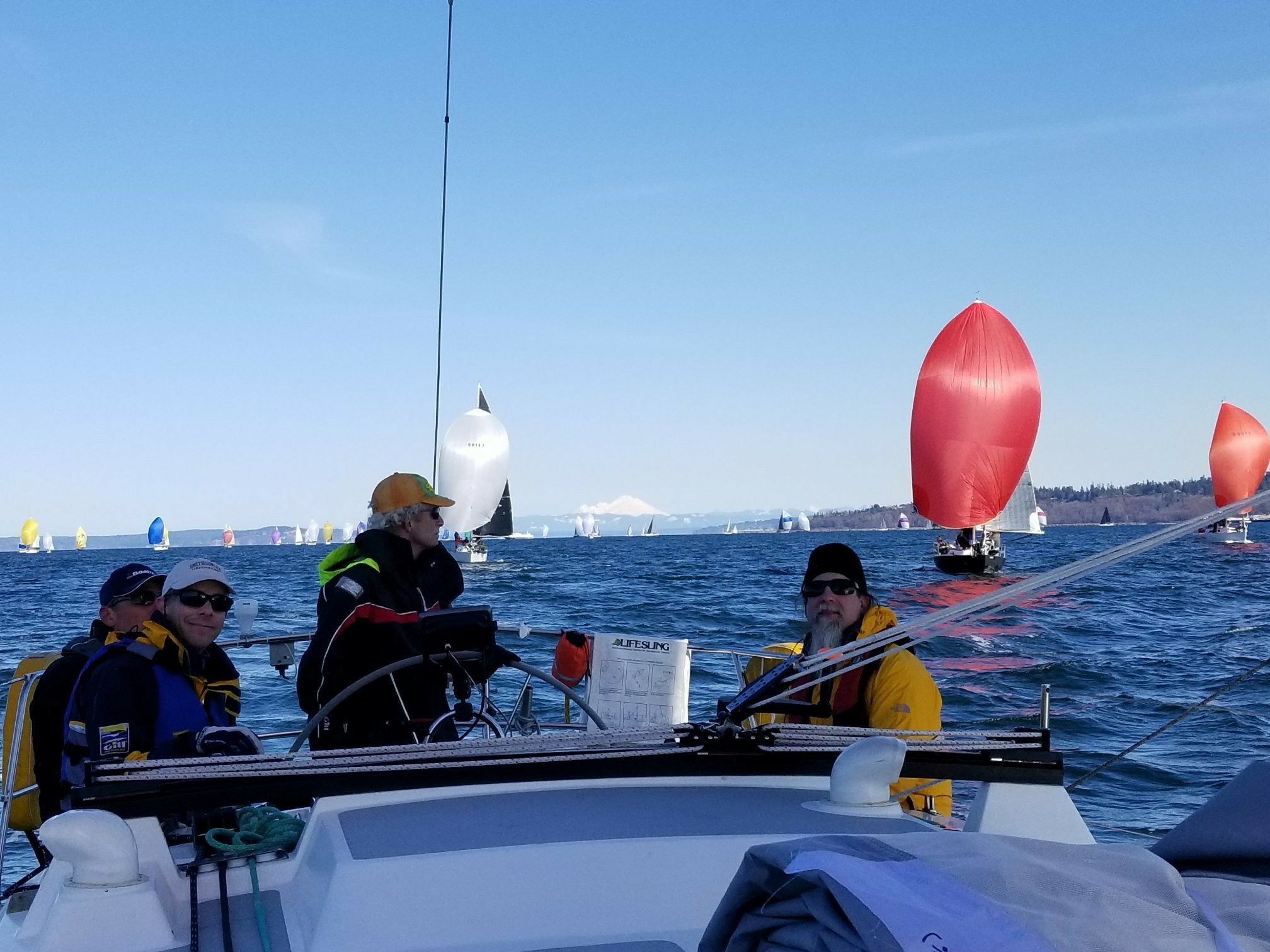 What has been a bad luck race for us the past 2 years almost became 3 in a row with an adrenaline charged pre-start. I was thinking we were done before we started but the foredeck pushed through and sorted things out just in time to get us to the line for a nearly perfect port tack start. We ended up rounding the modified (for the predicted light air forecast) course's first upwind mark second overall! Eventually the faster boats rolled us but it was fun to be up front for a while. It was hard work with just the 5 of us with the big J1 needed for 3 upwind legs. Then we had the 2 downwind legs to round West Point twice. The weather was very nice and the wind held all day. We had a few issues which cost us some time but all things considered we did well. I even managed to forget to feather the prop and that was my gift to the rest our division.