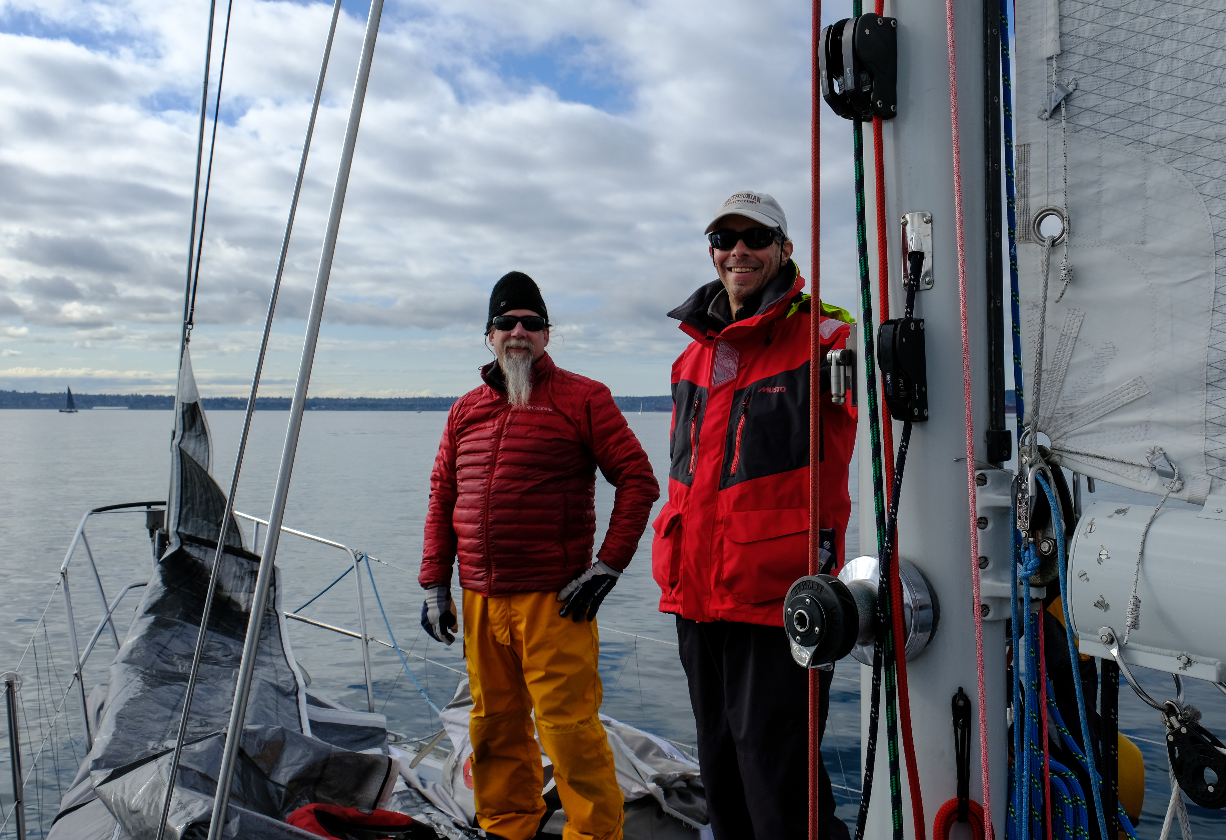 Things got a bit dicey rounding Entrance Island as we tried to dowse the kite a bit late but we got it sorted and headed back upwind with the #3 jib. We elected to go with the #3 to make life easier for the short handed crew on the night watches. This turned out to be a good choice as there were times the winds were up over the #1's 15k limit. Our approach to Ballenas saw us overstand a bit and this let Kraken catch us up and slide inside. We were side by side with them as we hoisted the A2 again for the run back across to the finish. Kraken sailed on south as we turned east across the strait. We should have gone south.